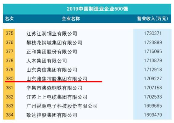 近日,在2019中国500强企业高峰论坛上,中国企业联合会、中国企业家协会联合发布了“2019中国制造业企业500强”榜单,山东潍焦控股集团有限公司再次荣登榜单,位列中国制造业企业500强第380位,比去年提高了一个位次。