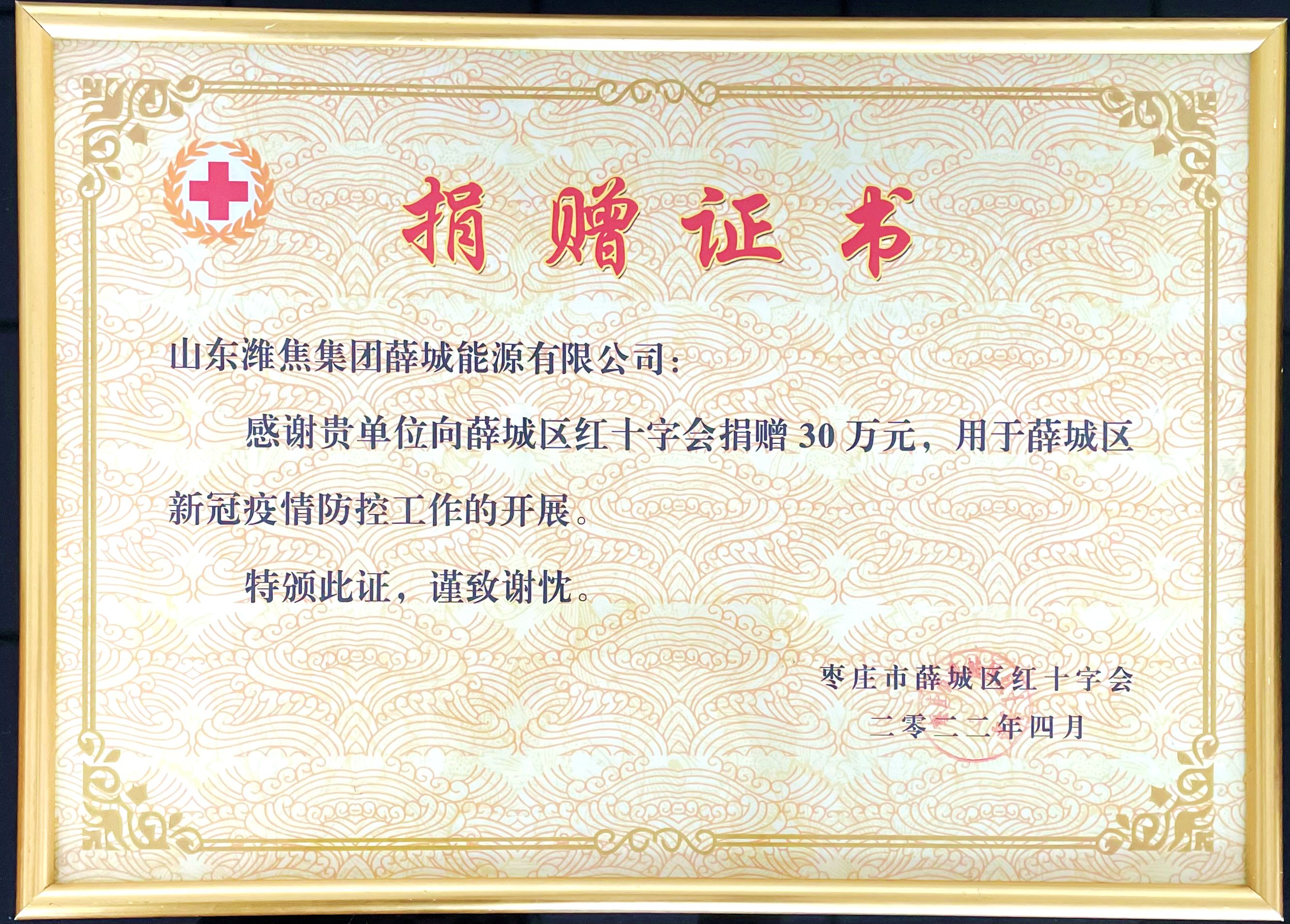 4月11日,薛城能源公司收到枣庄市薛城区红十字会颁发的捐赠证书及区委统筹疫情防控和经济运行工作领导小组发来的感谢信,感谢企业为地区疫情防控慷慨捐赠30万元!