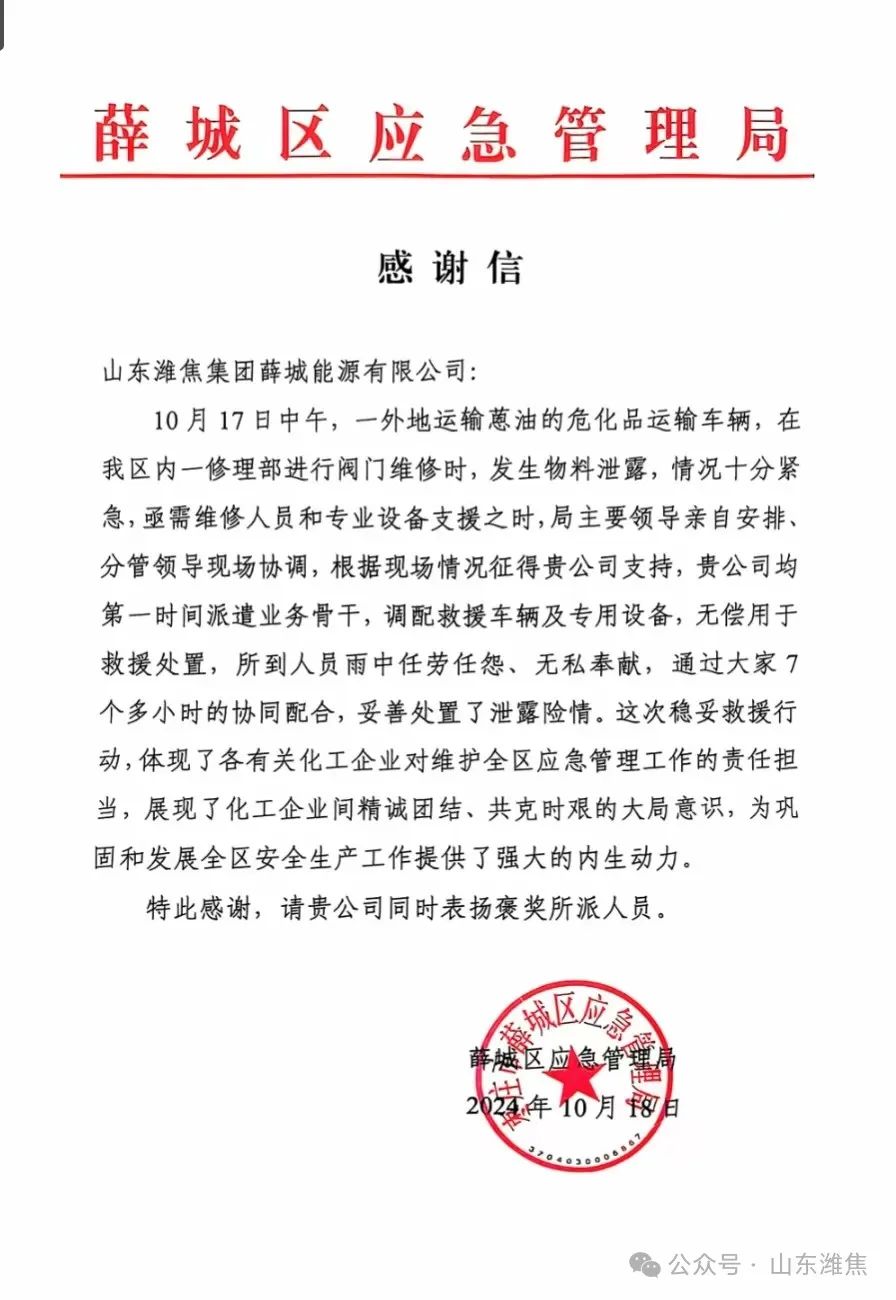 10月17日中午,一外地运输蒽油的危化品运输车辆,在薛城区一车辆修理部进行阀门维修时,突发危化品物料泄漏事故,情况十分紧急,薛城能源公司接讯后,派遣业务骨干,调配救援车辆及专用设备,无偿用于救援处置。参加救援人员冒雨操作,任劳任怨、无私奉献,经过7个多小时的协同配合、紧急救援,危化品泄漏险情成功妥善处置。