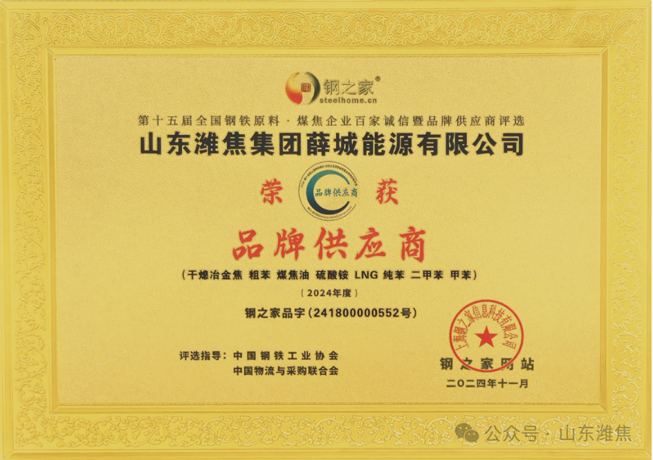 近日,“钢之家第十五届全国钢铁原料·煤焦企业百家诚信暨品牌供应商”评选活动顺利举行,经钢之家网站征信取证,中国钢铁工业协会及中国物流与采购联合会专家评审,薛城能源公司被评为2024年度“品牌供应商”殊荣。
